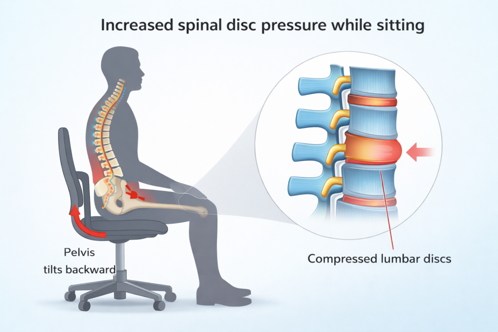 When you sit, your spine is placed under more pressure than when you stand or walk. Your pelvis tilts backward and your natural lower back curve flattens.
