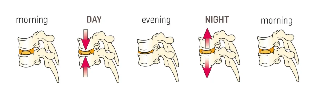 While you sleep, spinal discs absorb fluid and slightly expand.
